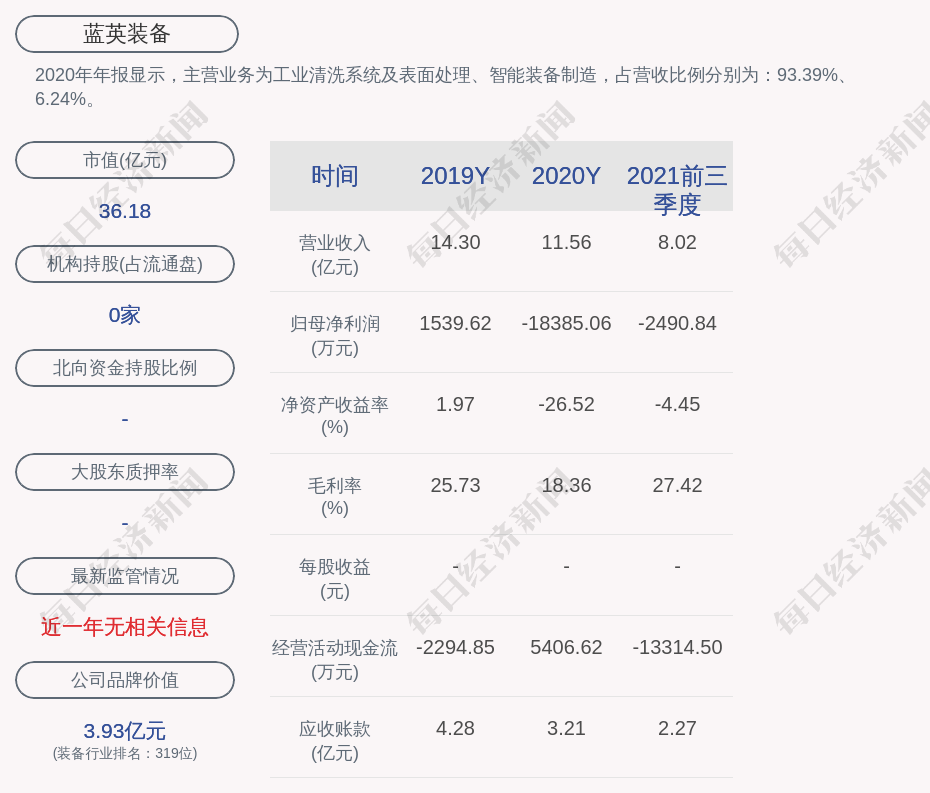 2020年年报显示,蓝英装备的主营业务为工业清洗系统及表面处理、智能装备制造,占营收比例分别为:93.39%、6.24%。