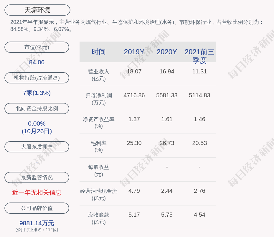 2021年半年报显示,天壕环境的主营业务为燃气行业、生态保护和环境治理(水务)、节能环保行业,占营收比例分别为:84.58%、9.34%、6.07%。