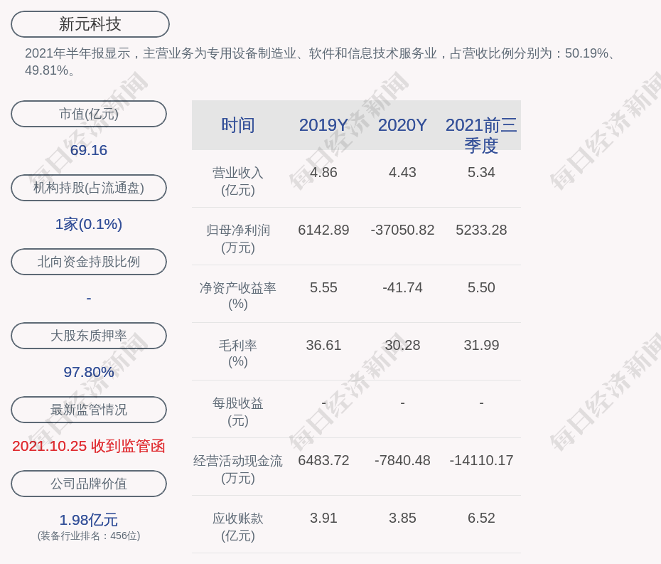 2021年半年报显示,新元科技的主营业务为专用设备制造业、软件和信息技术服务业,占营收比例分别为:50.19%、49.81%。