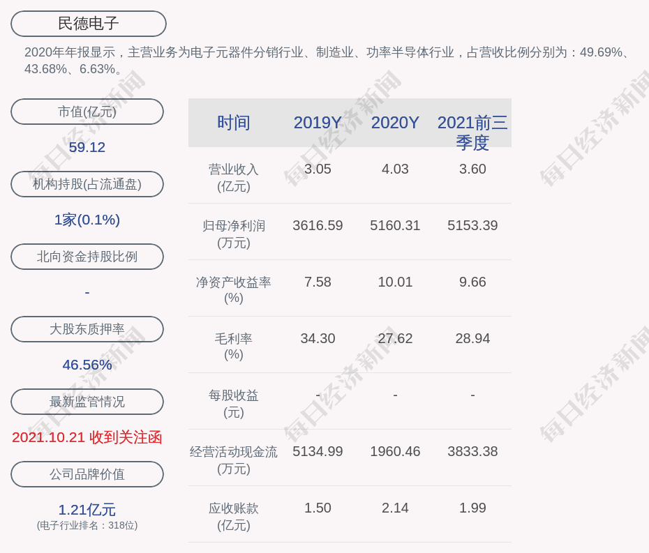 2020年年报显示,民德电子的主营业务为电子元器件分销行业、制造业、功率半导体行业,占营收比例分别为:49.69%、43.68%、6.63%。