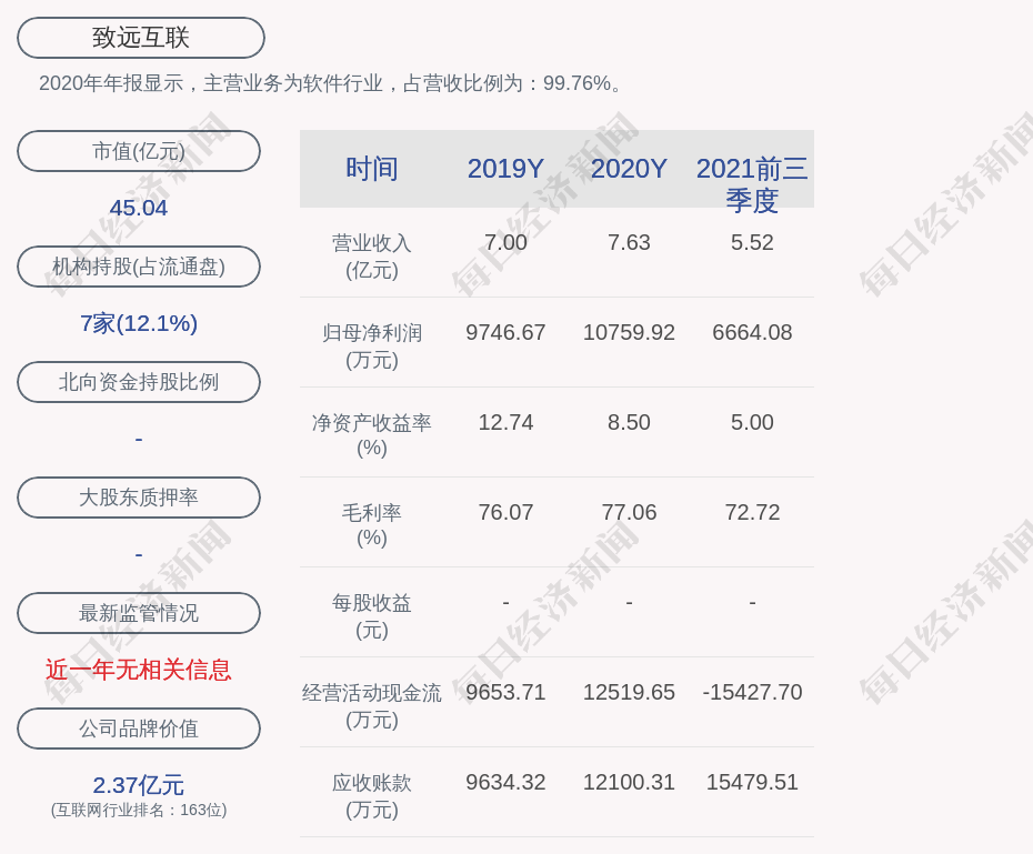 2020年年报显示,致远互联的主营业务为软件行业,占营收比例为:99.76%。