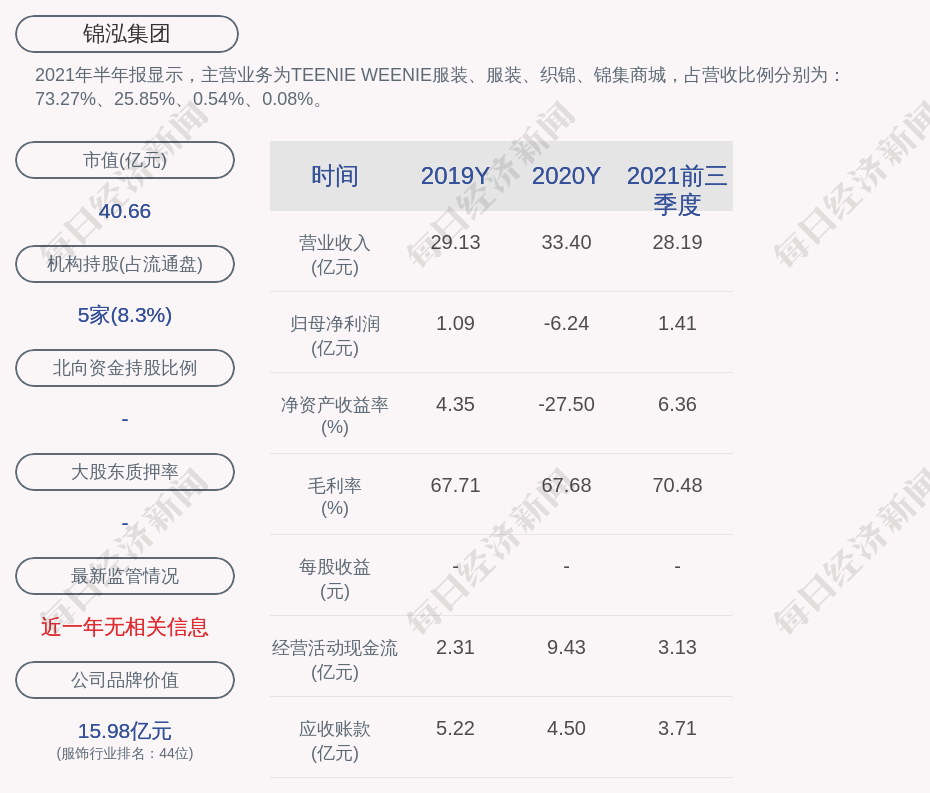 2021年半年报显示,锦泓集团的主营业务为TEENIE WEENIE服装、服装、织锦、锦集商城,占营收比例分别为:73.27%、25.85%、0.54%、0.08%。