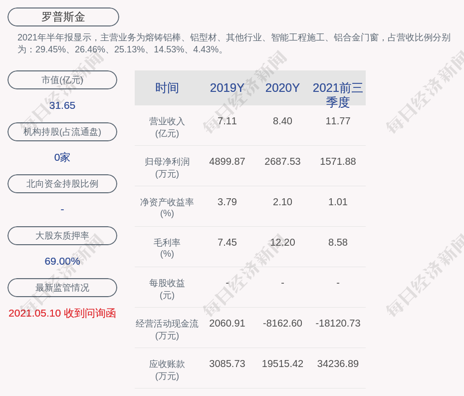 2021年半年报显示,罗普斯金的主营业务为熔铸铝棒、铝型材、其他行业、智能工程施工、铝合金门窗,占营收比例分别为:29.45%、26.46%、25.13%、14.53%、4.43%。