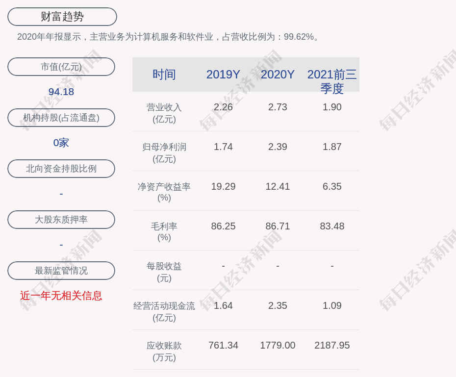 2020年年报显示,财富趋势的主营业务为计算机服务和软件业,占营收比例为:99.62%。