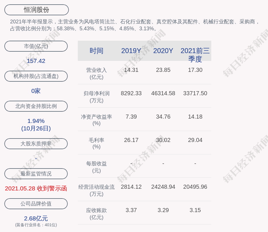 2021年半年报显示,恒润股份的主营业务为风电塔筒法兰、石化行业配套、真空腔体及其配件、机械行业配套、采购商,占营收比例分别为:58.38%、5.43%、5.15%、4.85%、3.13%。