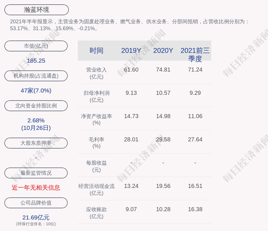 2021年半年报显示,瀚蓝环境的主营业务为固废处理业务、燃气业务、供水业务、分部间抵销,占营收比例分别为:53.17%、31.13%、15.69%、-0.21%。