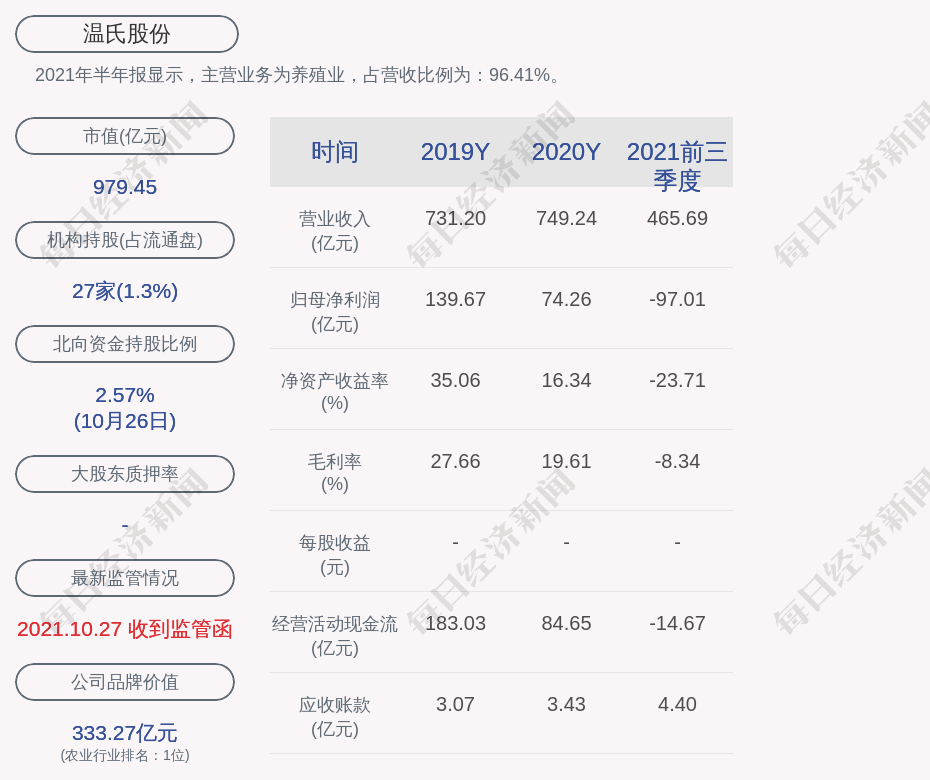 2021年半年报显示,温氏股份的主营业务为养殖业,占营收比例为:96.41%。