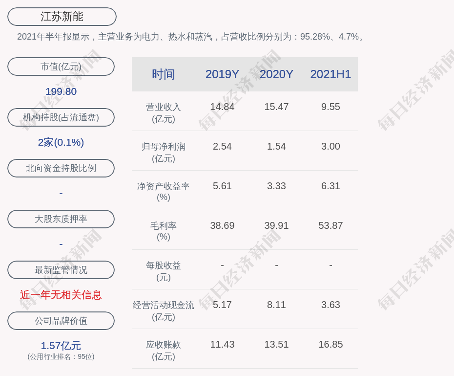 2021年半年报显示,江苏新能的主营业务为电力、热水和蒸汽,占营收比例分别为:95.28%、4.7%。