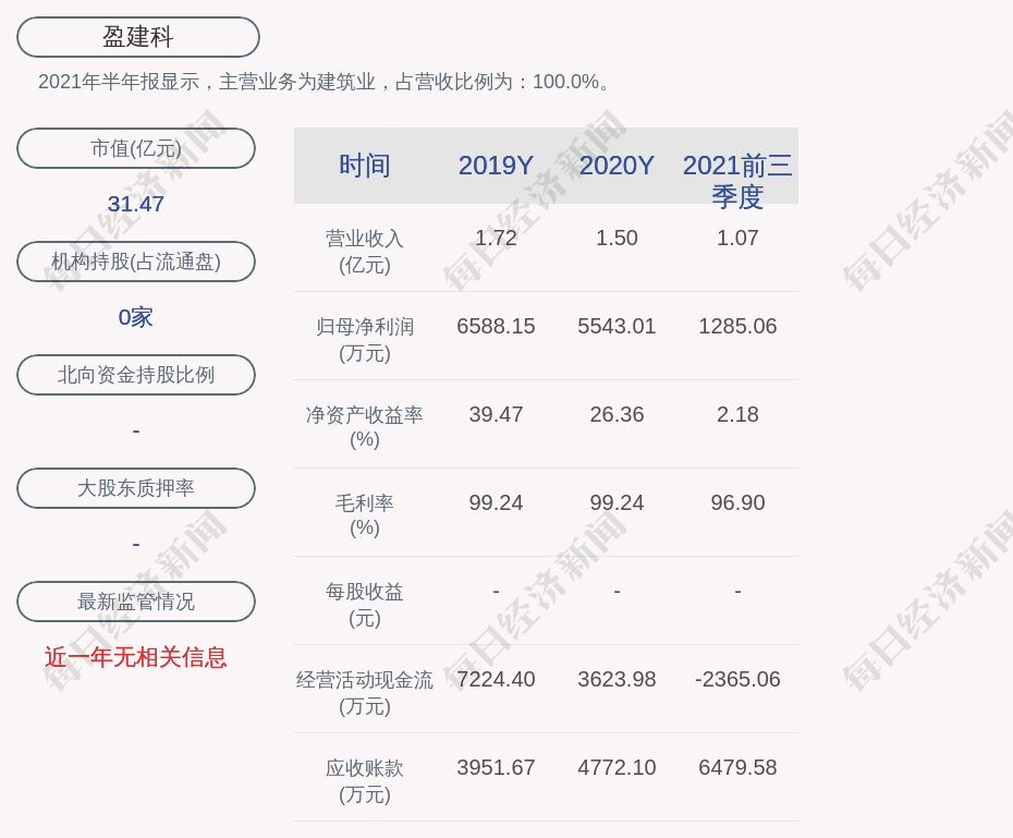 2021年半年报显示,盈建科的主营业务为建筑业,占营收比例为:100.0%。