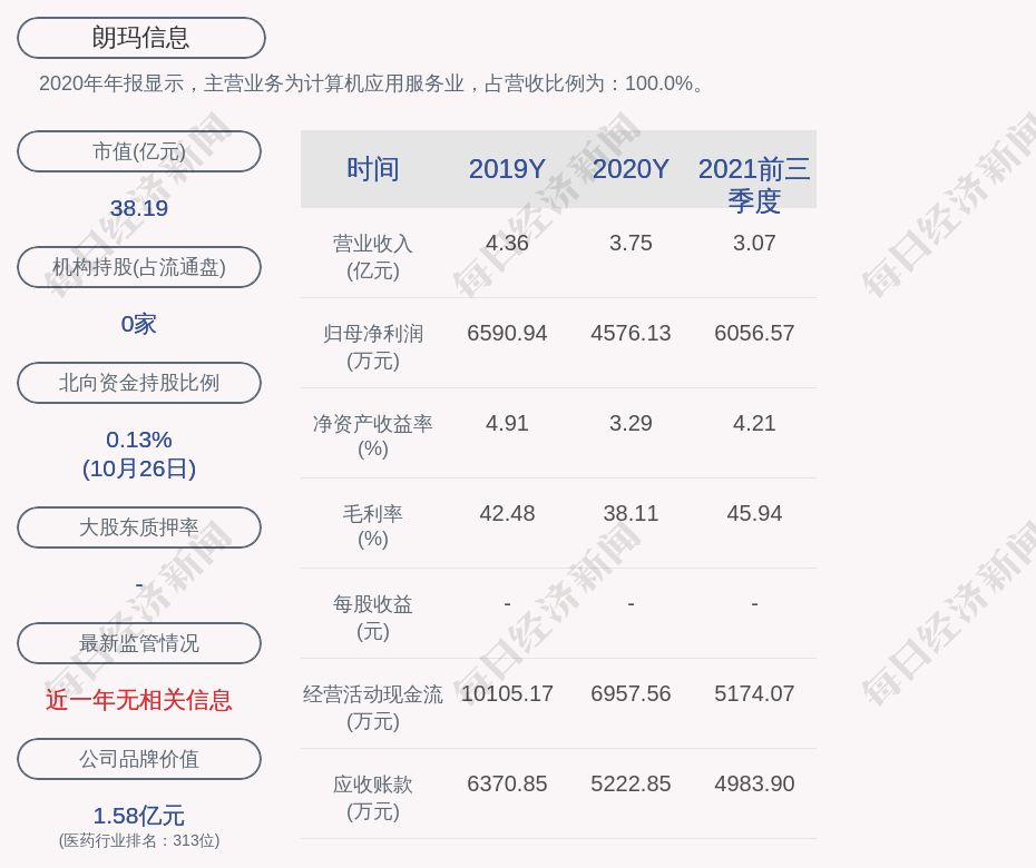2020年年报显示,朗玛信息的主营业务为计算机应用服务业,占营收比例为:100.0%。