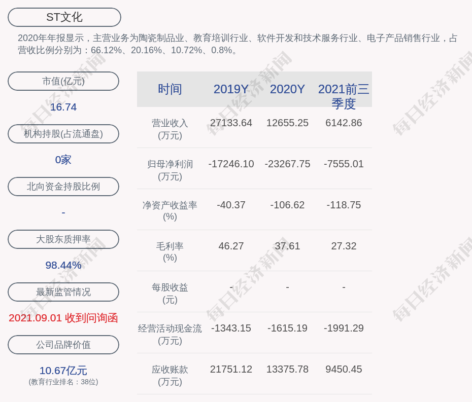 2020年年报显示,ST文化的主营业务为陶瓷制品业、教育培训行业、软件开发和技术服务行业、电子产品销售行业,占营收比例分别为:66.12%、20.16%、10.72%、0.8%。