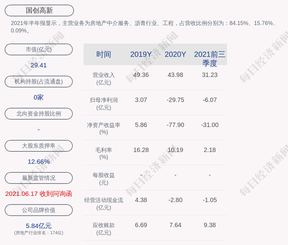 2021年半年报显示,国创高新的主营业务为房地产中介服务、沥青行业、工程,占营收比例分别为:84.15%、15.76%、0.09%。