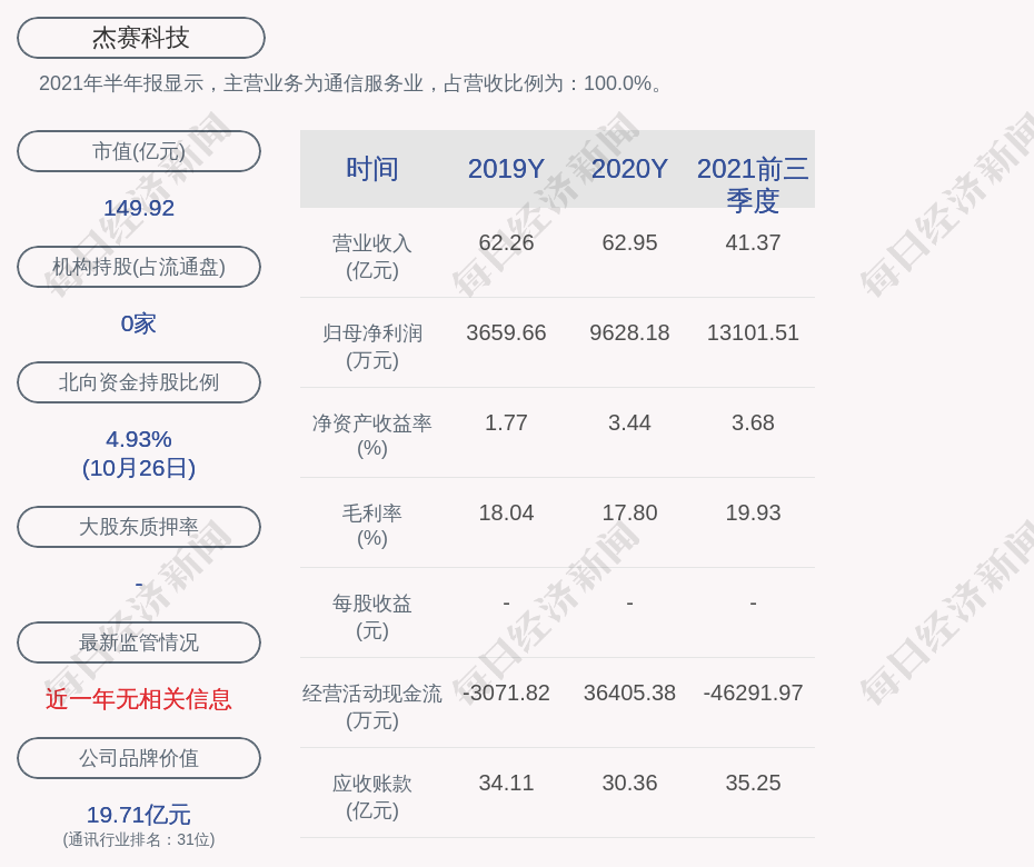 2021年半年报显示,杰赛科技的主营业务为通信服务业,占营收比例为:100.0%。