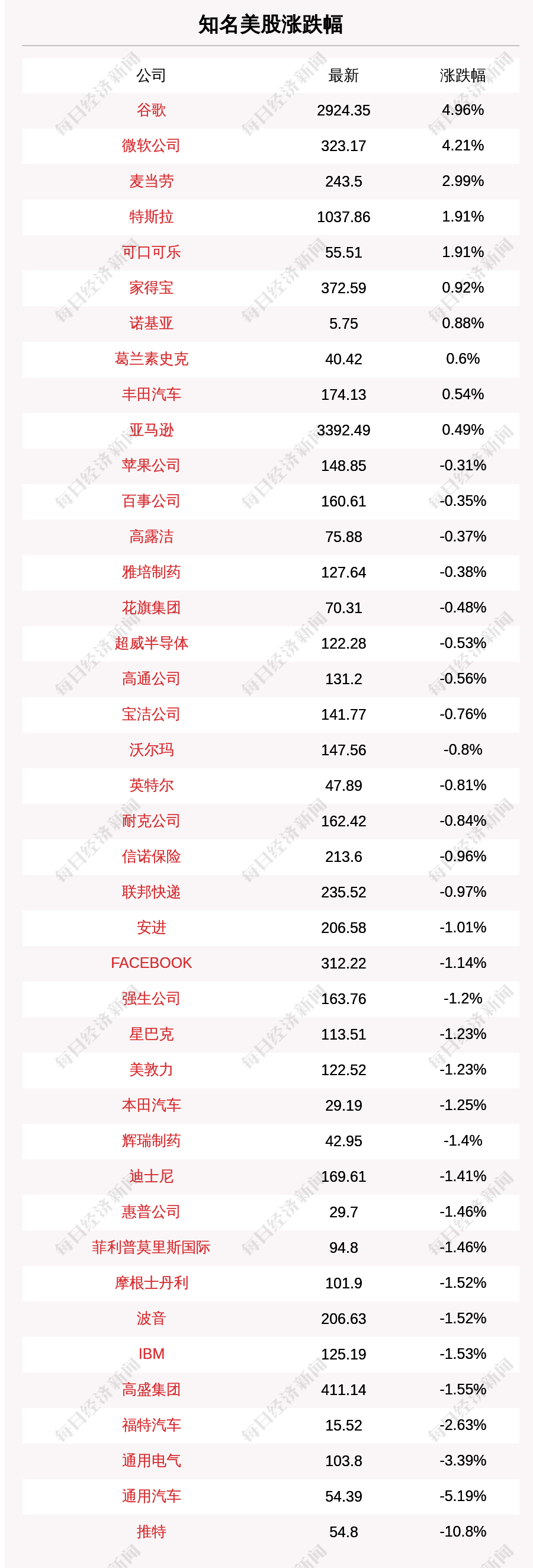 每经AI快讯:北京时间10月28日04:00,知名美股中谷歌、微软公司、麦当劳、特斯拉、可口可乐涨幅居前,收盘分别上涨4.96%、4.21%、2.99%、1.91%、1.91%。推特、通用汽车、通用电气、福特汽车、高盛集团跌幅居前,收盘分别下跌10.8%、5.19%、3.39%、2.63%、1.55%。