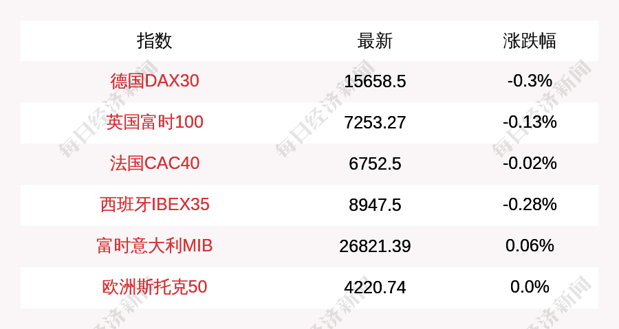 每经AI快讯:北京时间10月28日15:00,德国DAX30指数开盘下跌47.31点,跌幅为0.3%,报15658.5点;英国富时100指数开盘下跌9.76点,跌幅为0.13%,报7243.51点;法国CAC40指数开盘下跌1.02点,跌幅为0.02%,报6752.5点;西班牙IBEX35指数开盘下跌24.8点,跌幅为0.28%,报8947.5点;富时意大利MIB指数开盘上涨15.2点,涨幅为0.06%,报26821.39点;欧洲斯托克50指数平开,报4220.74点。