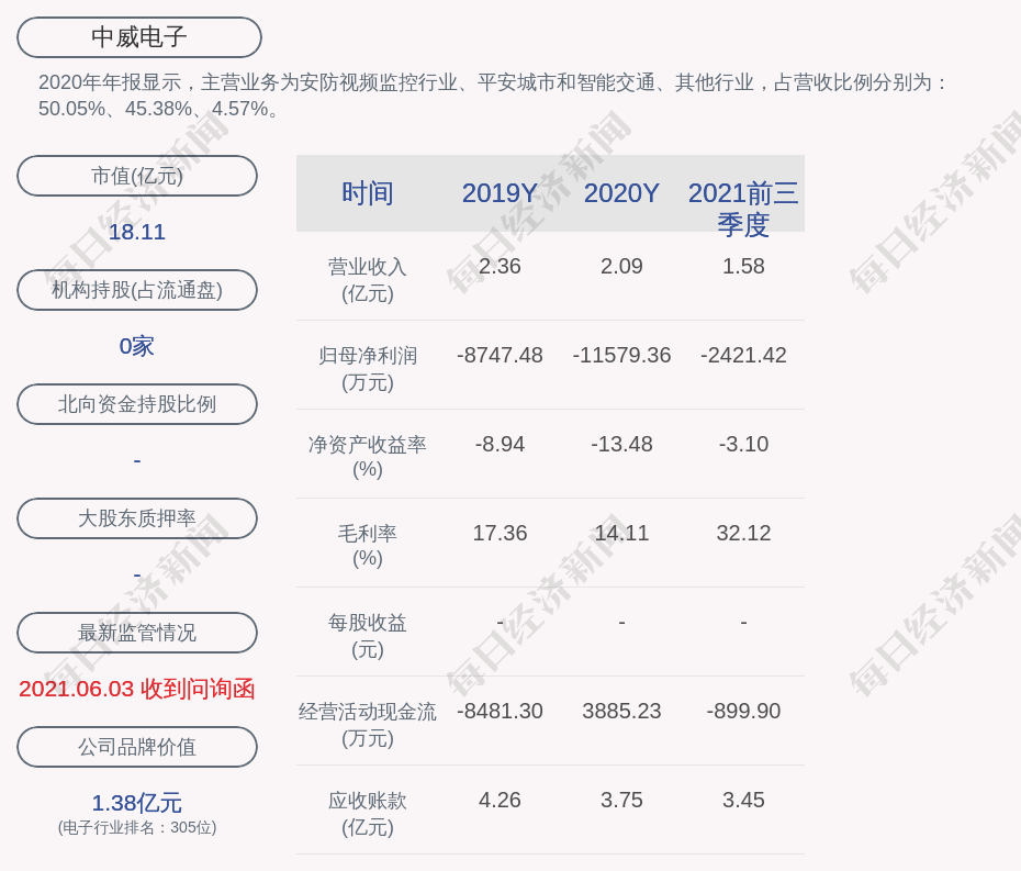 2020年年报显示,中威电子的主营业务为安防视频监控行业、平安城市和智能交通、其他行业,占营收比例分别为:50.05%、45.38%、4.57%。