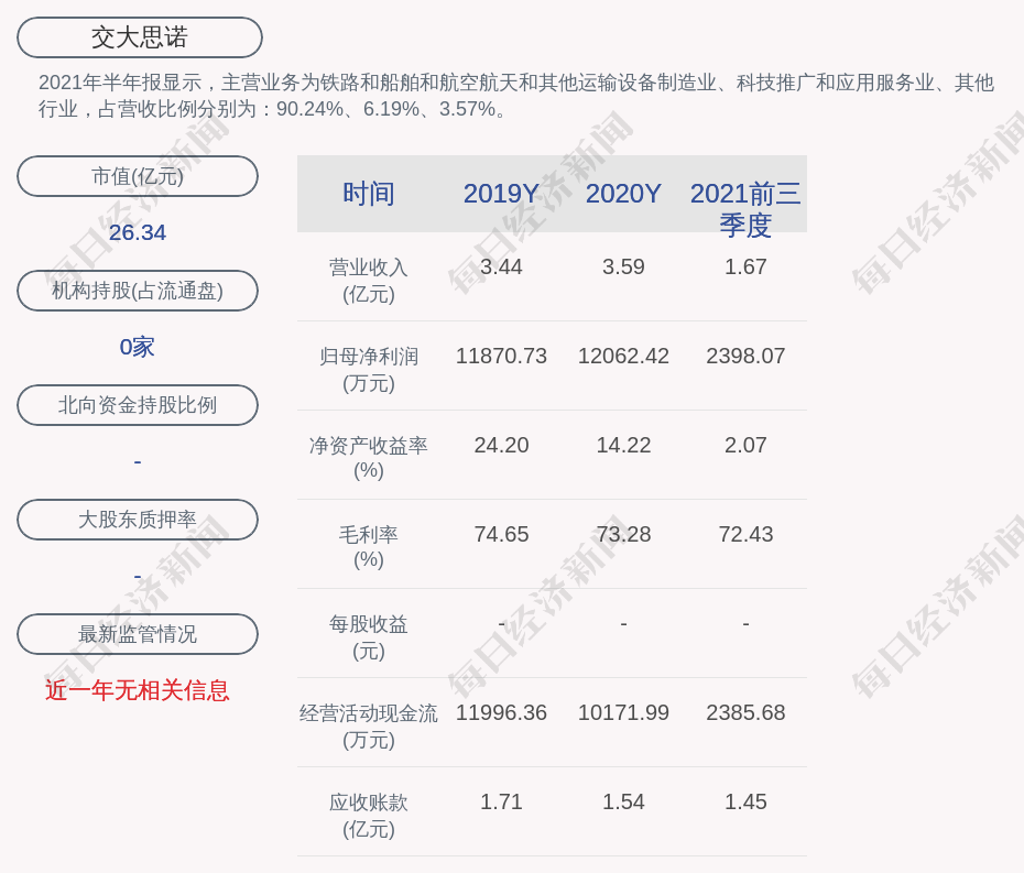 2021年半年报显示,交大思诺的主营业务为铁路和船舶和航空航天和其他运输设备制造业、科技推广和应用服务业、其他行业,占营收比例分别为:90.24%、6.19%、3.57%。