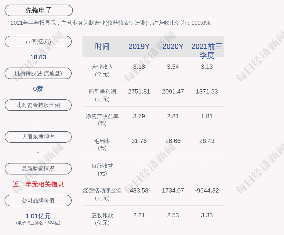 2021年半年报显示,先锋电子的主营业务为制造业(仪器仪表制造业),占营收比例为:100.0%。