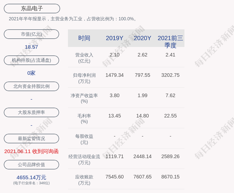 2021年半年报显示,东晶电子的主营业务为工业,占营收比例为:100.0%。