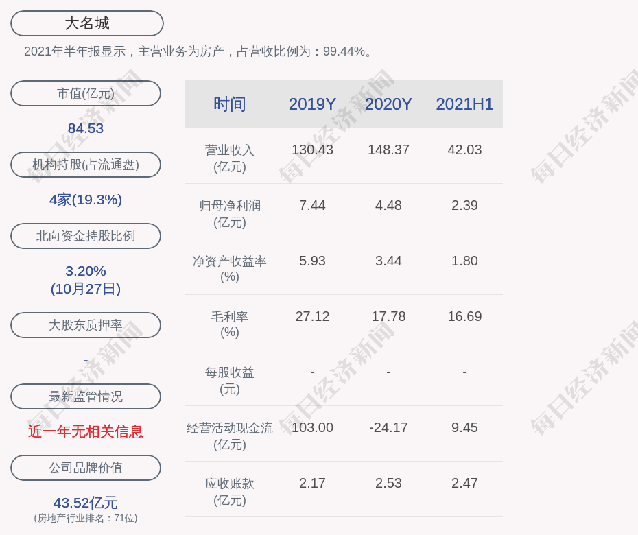 2021年半年报显示,大名城的主营业务为房产,占营收比例为:99.44%。