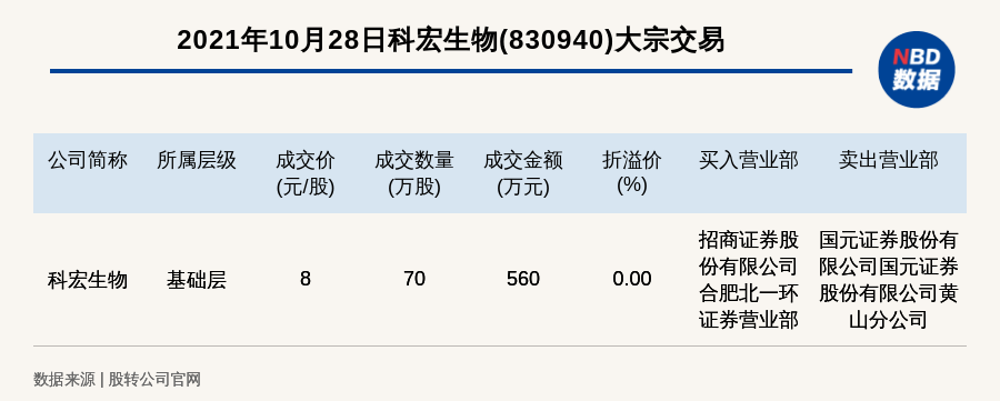 每经AI快讯,2021年10月28日,新三板基础层公司科宏生物(830940)发生一笔大宗交易,成交价8元/股,成交数量70万股,成交金额560万元,为平价交易。买入营业部是招商证券股份有限公司合肥北一环证券营业部,卖出营业部是国元证券股份有限公司国元证券股份有限公司黄山分公司。