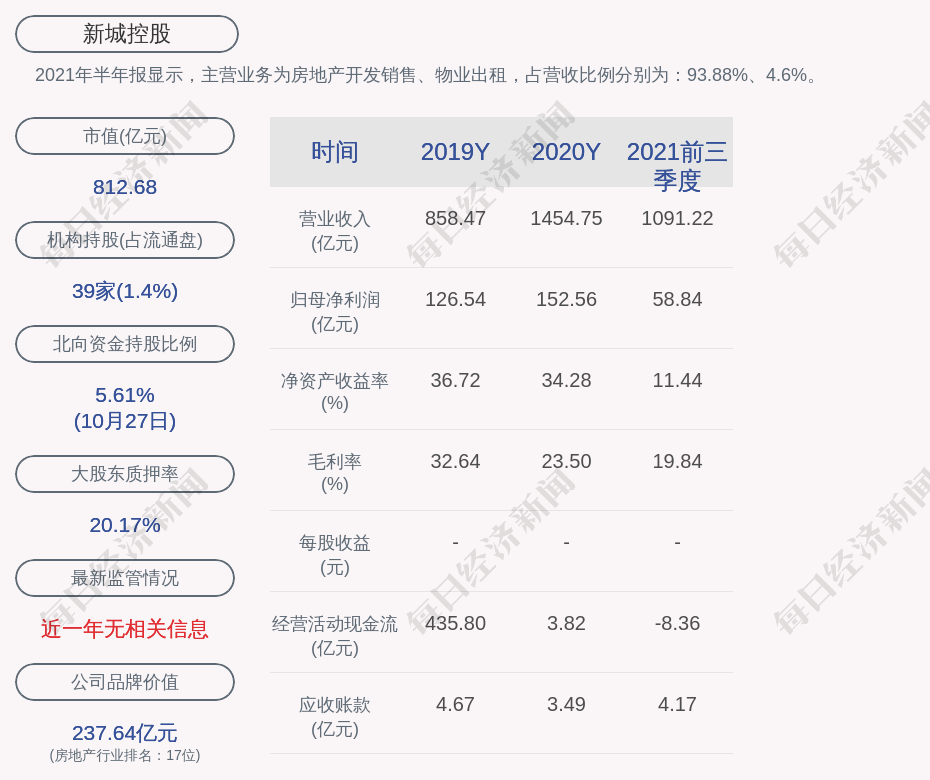 2021年半年报显示,新城控股的主营业务为房地产开发销售、物业出租,占营收比例分别为:93.88%、4.6%。