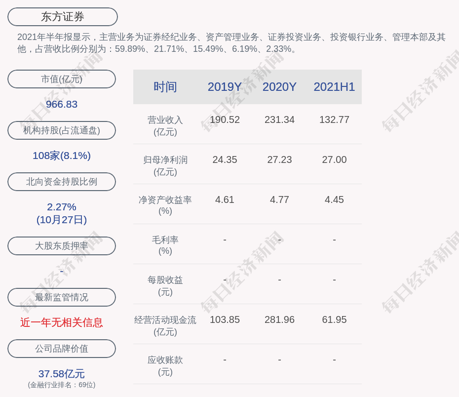 2021年半年报显示,东方证券的主营业务为证券经纪业务、资产管理业务、证券投资业务、投资银行业务、管理本部及其他,占营收比例分别为:59.89%、21.71%、15.49%、6.19%、2.33%。