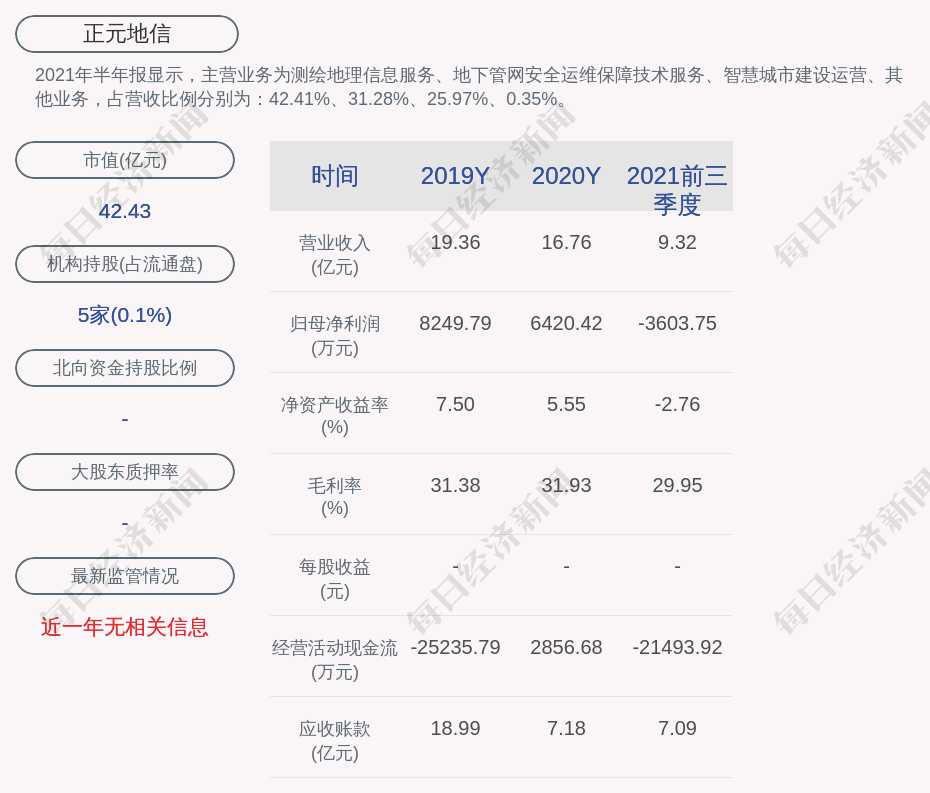 2021年半年报显示,正元地信的主营业务为测绘地理信息服务、地下管网安全运维保障技术服务、智慧城市建设运营、其他业务,占营收比例分别为:42.41%、31.28%、25.97%、0.35%。