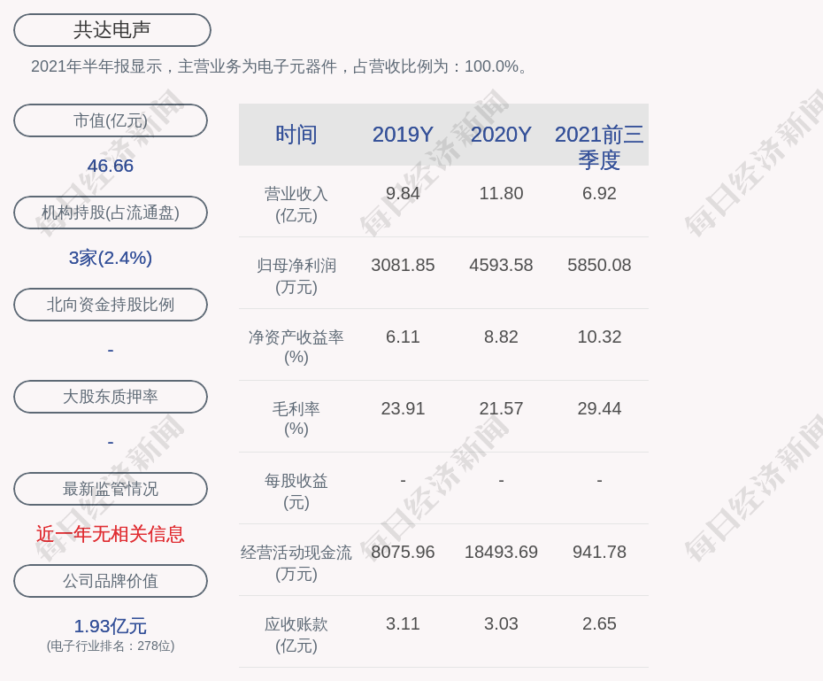 2021年半年报显示,共达电声的主营业务为电子元器件,占营收比例为:100.0%。