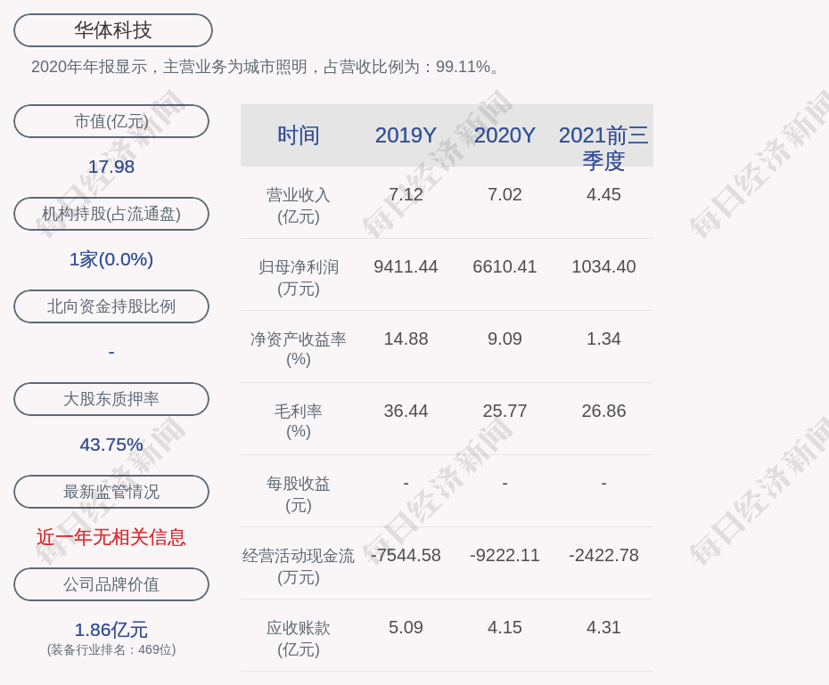 2020年年报显示,华体科技的主营业务为城市照明,占营收比例为:99.11%。