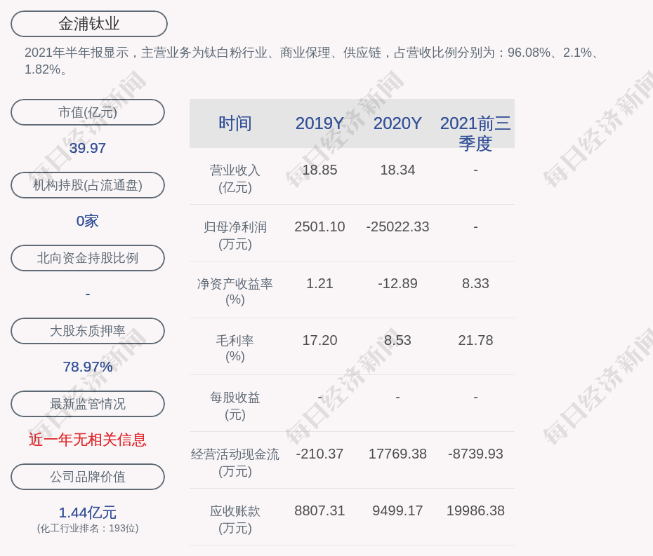 2021年半年报显示,金浦钛业的主营业务为钛白粉行业、商业保理、供应链,占营收比例分别为:96.08%、2.1%、1.82%。