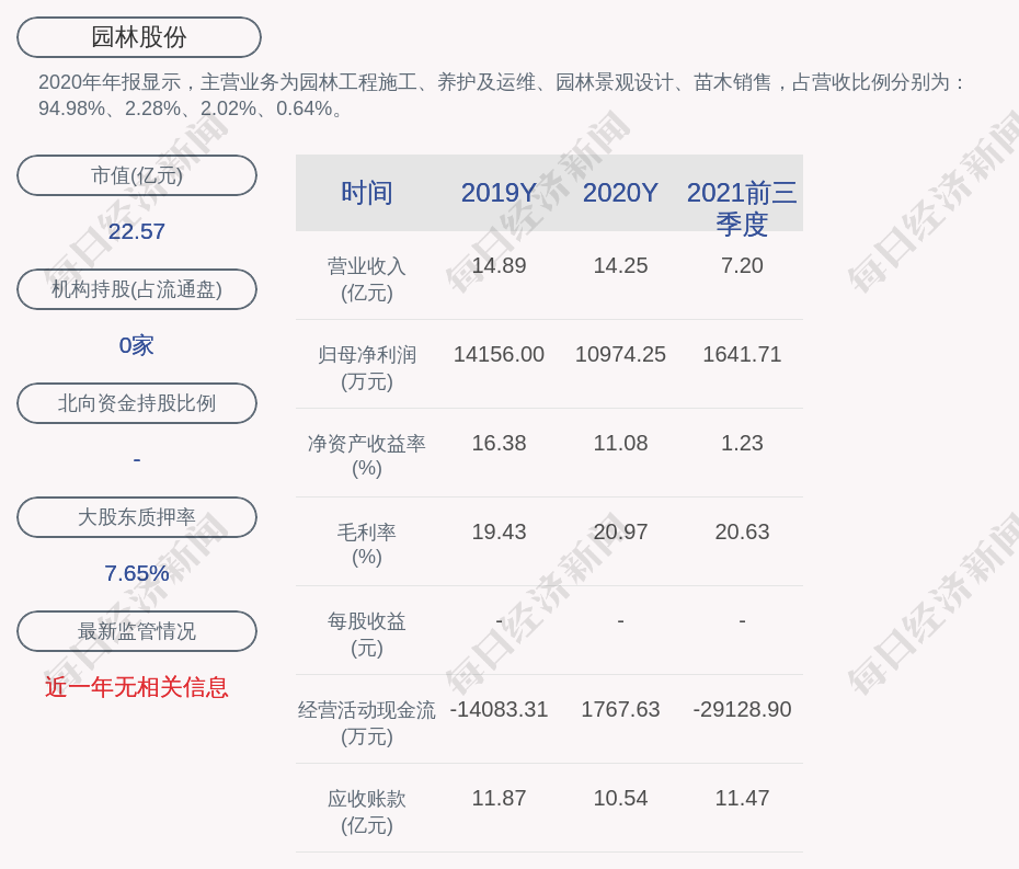2020年年报显示,园林股份的主营业务为园林工程施工、养护及运维、园林景观设计、苗木销售,占营收比例分别为:94.98%、2.28%、2.02%、0.64%。