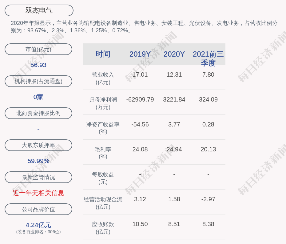 2020年年报显示,双杰电气的主营业务为输配电设备制造业、售电业务、安装工程、光伏设备、发电业务,占营收比例分别为:93.67%、2.3%、1.36%、1.25%、0.72%。