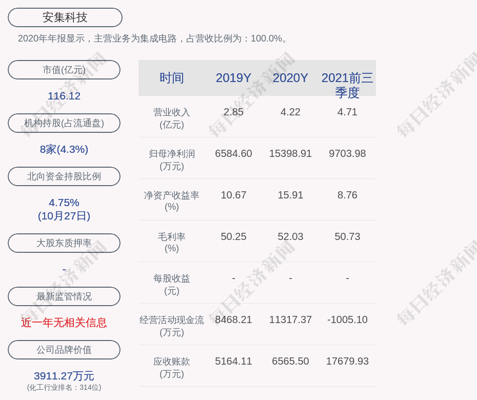 2020年年报显示,安集科技的主营业务为集成电路,占营收比例为:100.0%。
