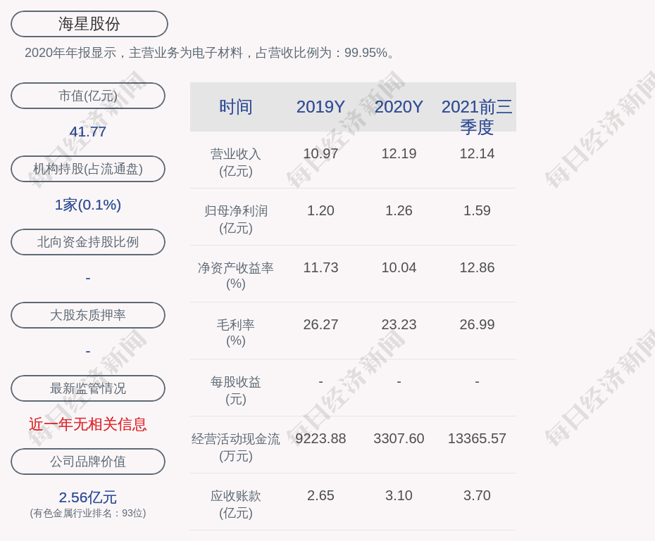 2020年年报显示,海星股份的主营业务为电子材料,占营收比例为:99.95%。