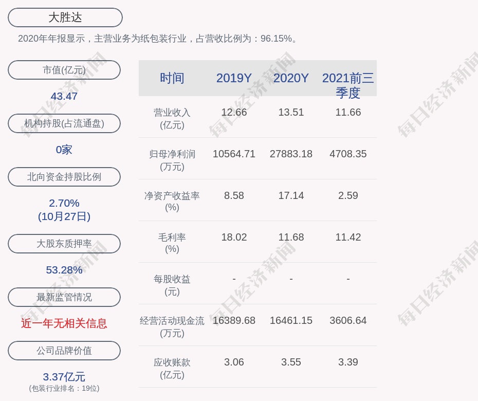 2020年年报显示,大胜达的主营业务为纸包装行业,占营收比例为:96.15%。