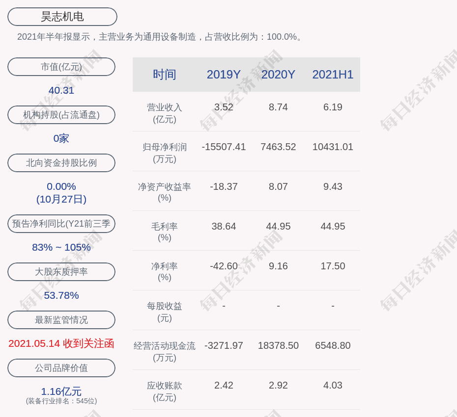 2021年半年报显示,昊志机电的主营业务为通用设备制造,占营收比例为:100.0%。