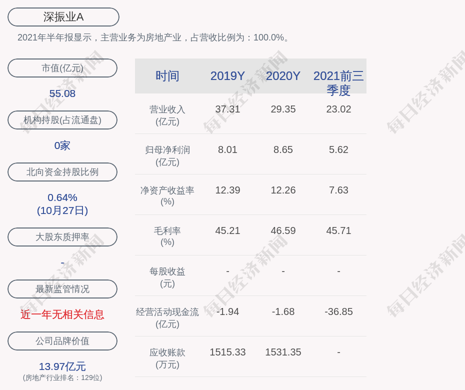 2021年半年报显示,深振业A的主营业务为房地产业,占营收比例为:100.0%。