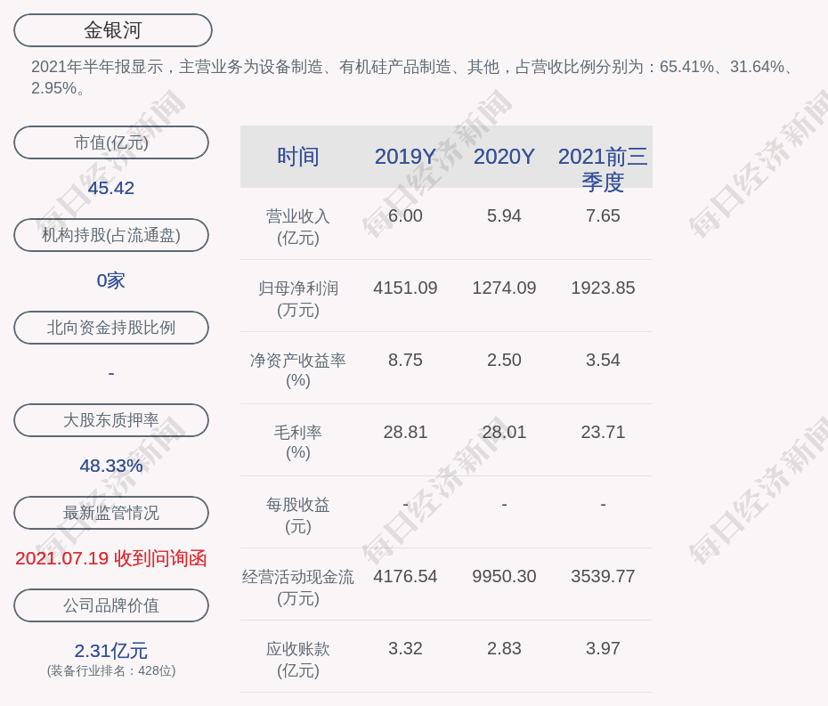 2021年半年报显示,金银河的主营业务为设备制造、有机硅产品制造、其他,占营收比例分别为:65.41%、31.64%、2.95%。