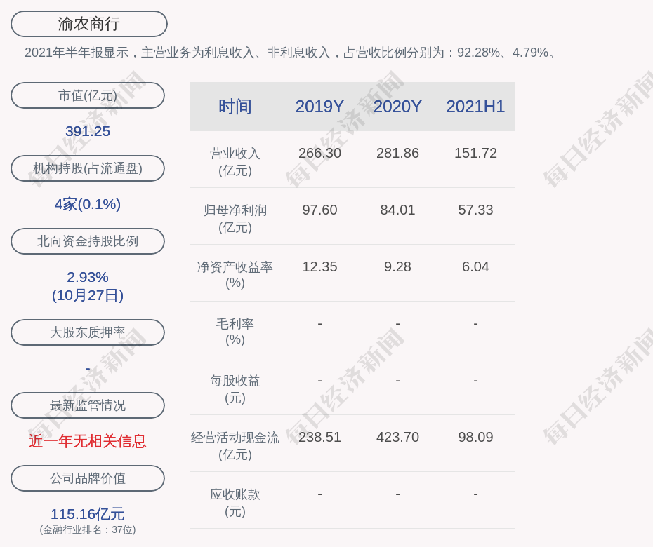 2021年半年报显示,渝农商行的主营业务为利息收入、非利息收入,占营收比例分别为:92.28%、4.79%。