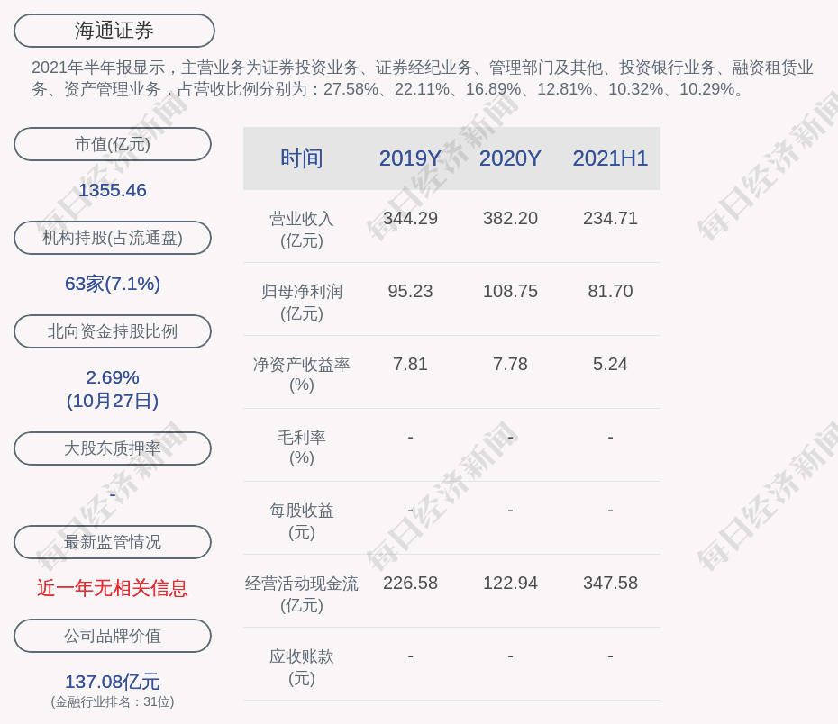 2021年半年报显示,海通证券的主营业务为证券投资业务、证券经纪业务、管理部门及其他、投资银行业务、融资租赁业务、资产管理业务,占营收比例分别为:27.58%、22.11%、16.89%、12.81%、10.32%、10.29%。