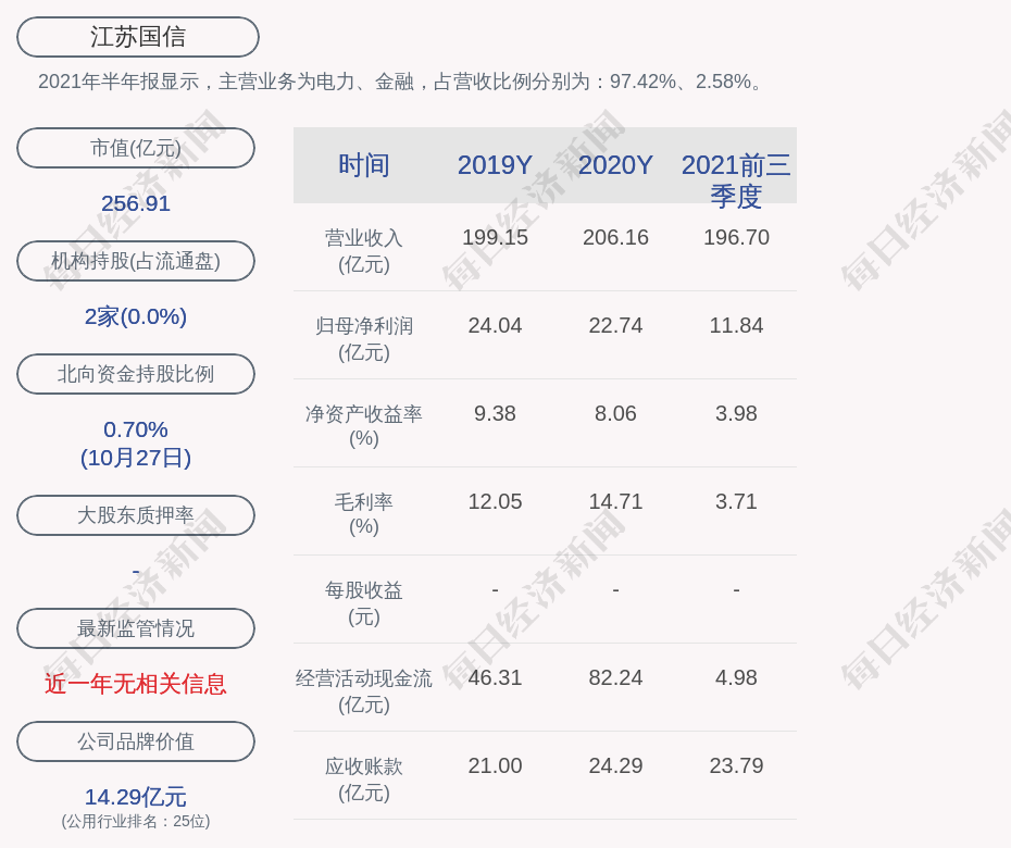 2021年半年报显示,江苏国信的主营业务为电力、金融,占营收比例分别为:97.42%、2.58%。