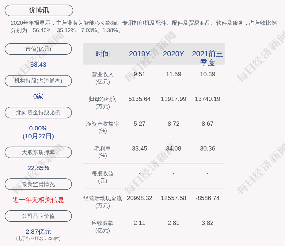 2020年年报显示,优博讯的主营业务为智能移动终端、专用打印机及配件、配件及贸易商品、软件及服务,占营收比例分别为:56.46%、35.12%、7.03%、1.38%。