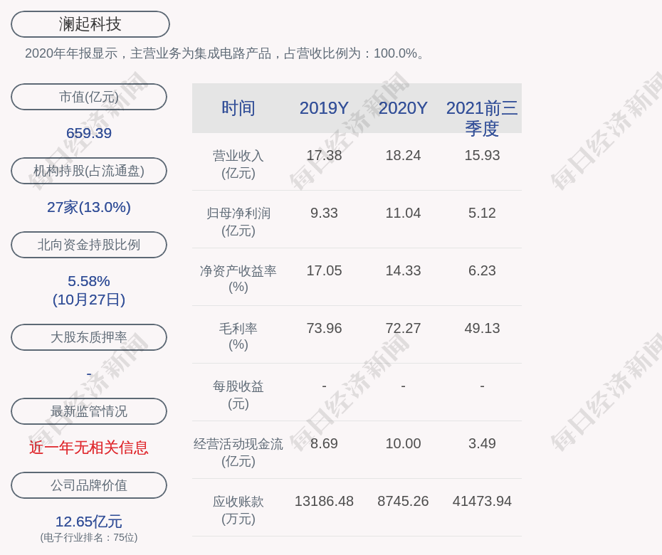 2020年年报显示,澜起科技的主营业务为集成电路产品,占营收比例为:100.0%。