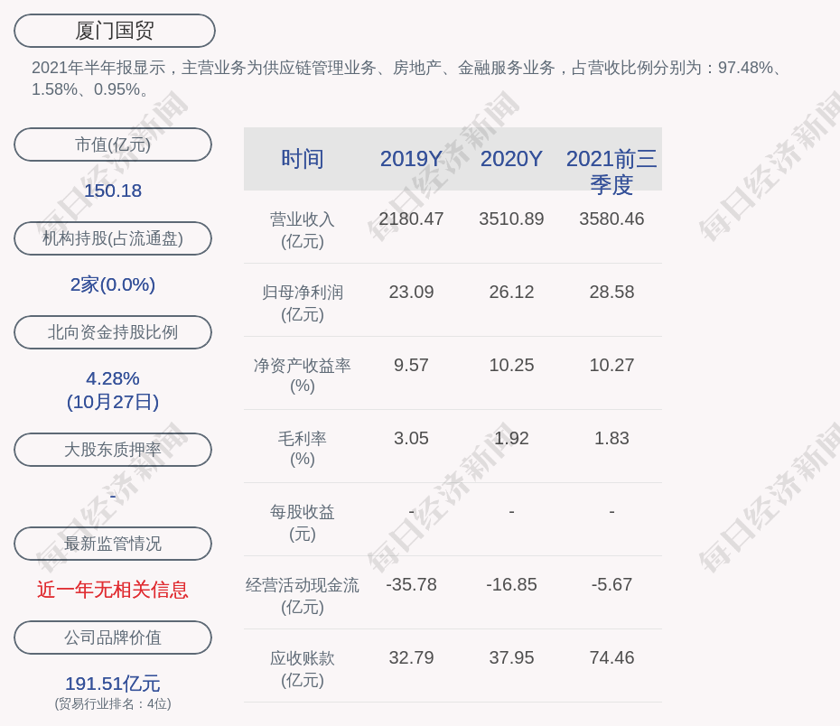 2021年半年报显示,厦门国贸的主营业务为供应链管理业务、房地产、金融服务业务,占营收比例分别为:97.48%、1.58%、0.95%。
