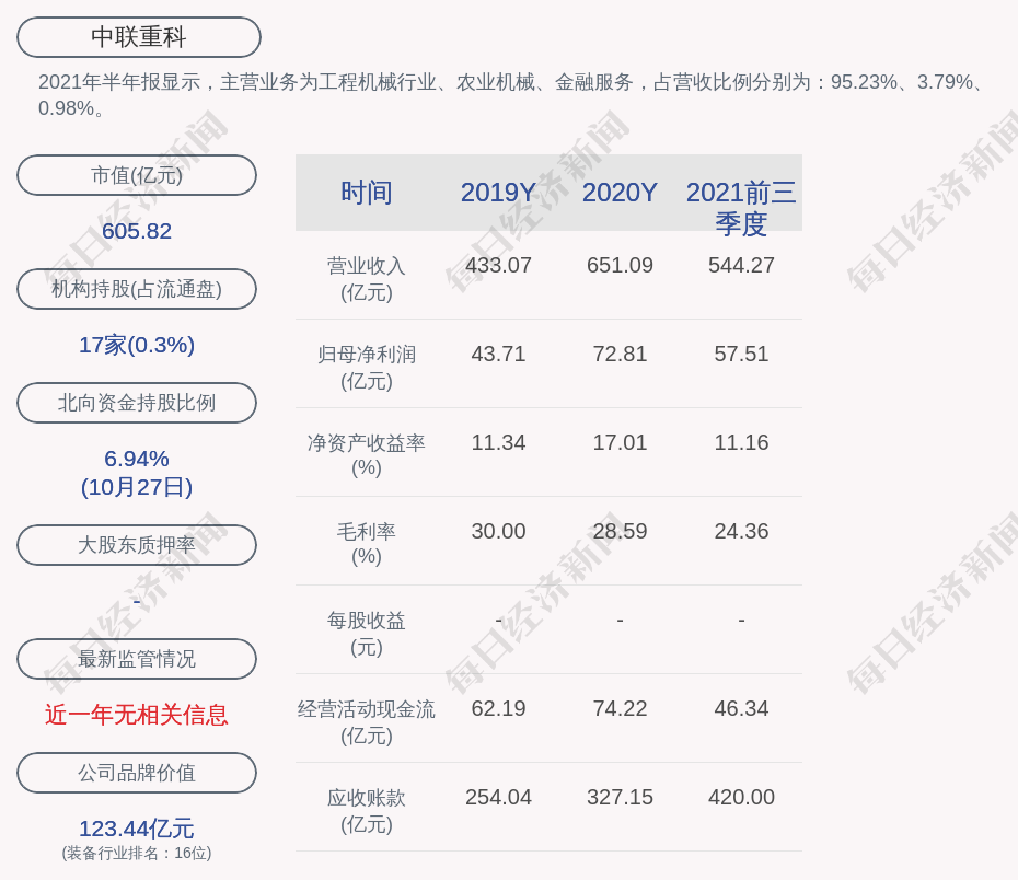 2021年半年报显示,中联重科的主营业务为工程机械行业、农业机械、金融服务,占营收比例分别为:95.23%、3.79%、0.98%。