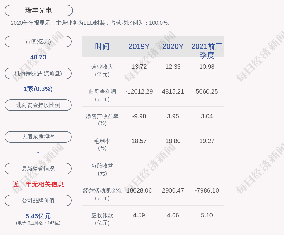 2020年年报显示,瑞丰光电的主营业务为LED封装,占营收比例为:100.0%。