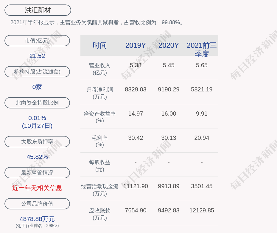 2021年半年报显示,洪汇新材的主营业务为氯醋共聚树脂,占营收比例为:99.88%。