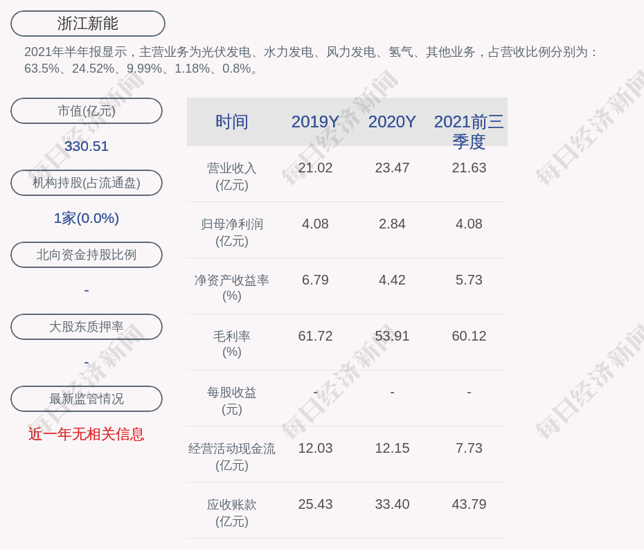 2021年半年报显示,浙江新能的主营业务为光伏发电、水力发电、风力发电、氢气、其他业务,占营收比例分别为:63.5%、24.52%、9.99%、1.18%、0.8%。