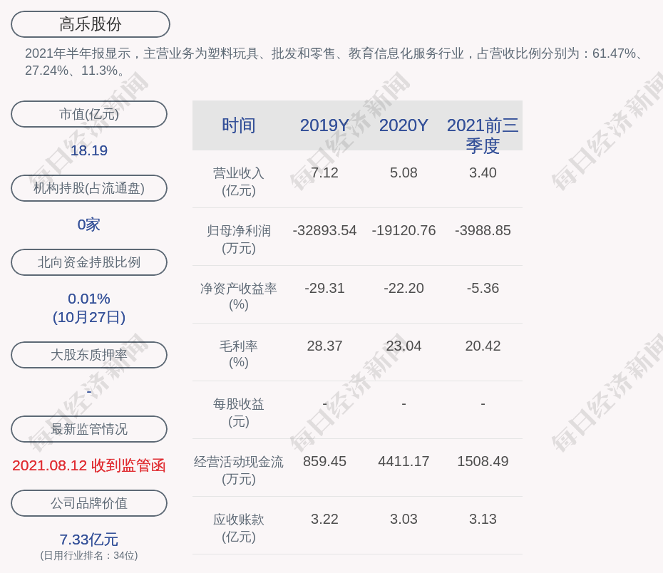 2021年半年报显示,高乐股份的主营业务为塑料玩具、批发和零售、教育信息化服务行业,占营收比例分别为:61.47%、27.24%、11.3%。